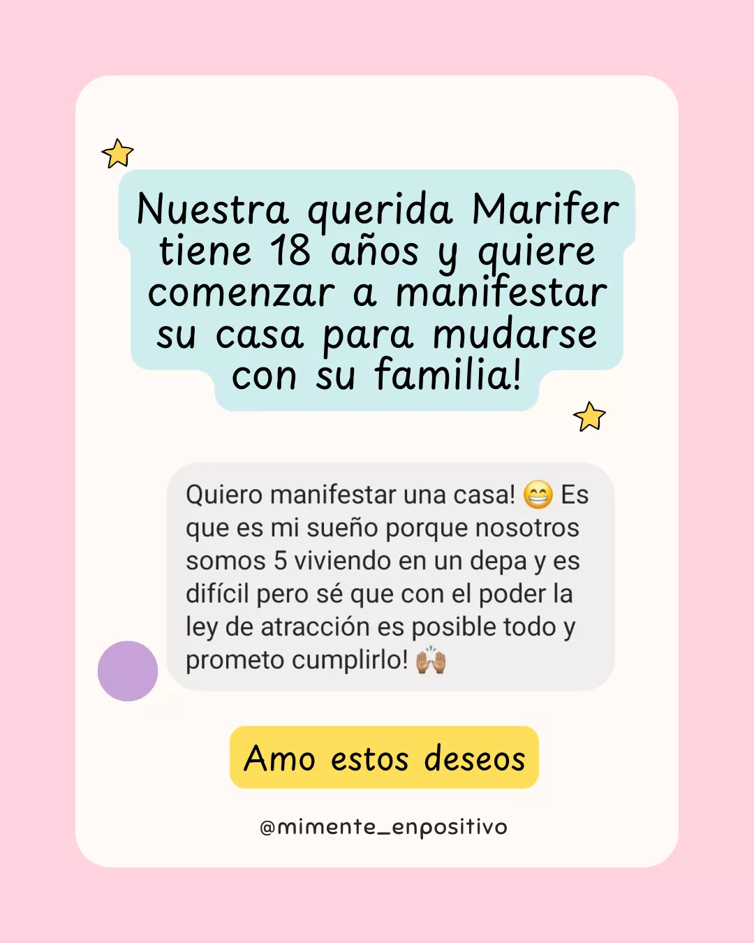 Hola, soy Angie, la creadora de @mimente_enpositivo. Durante más de 2 años, he tenido el privilegio de acompañarte en tu viaje hacia la práctica de la Ley de Atracción a través de Instagram. He compartido herramientas y consejos para que puedas atraer todo lo que deseas.