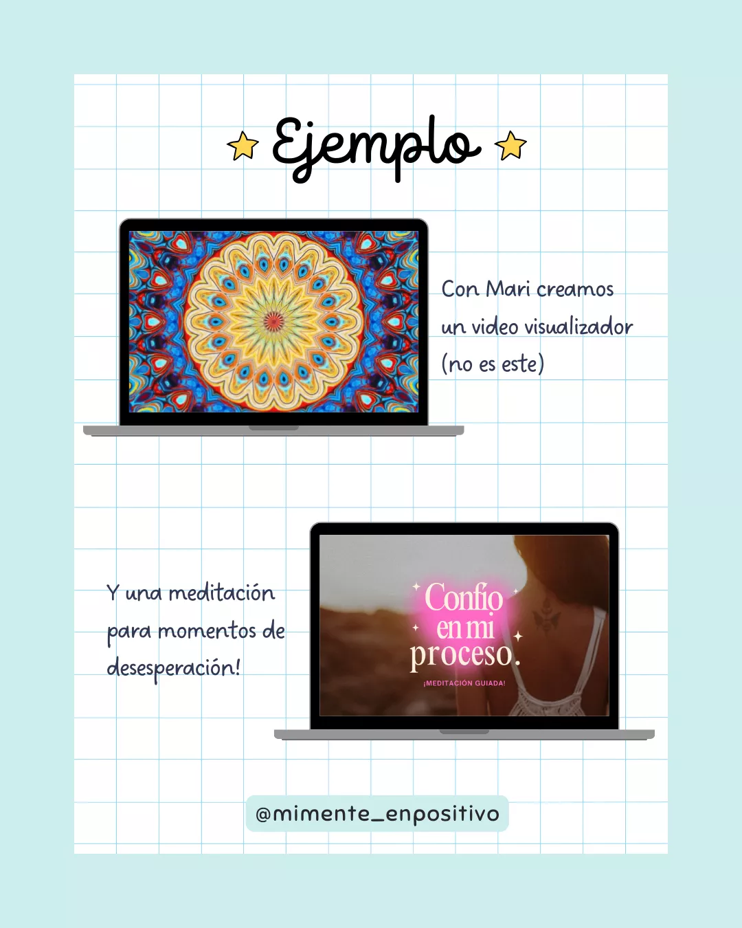 En una sesión personalizada, descubrimos su verdadera meta y la creencia limitante que la frenaba: sentía que su deseo no era posible. Creamos su vision board en fondo de pantalla y versión impresa para su cuaderno mágico, hicimos una meditación especial que se volvió su salvavidas emocional, y diseñé su video visualizador con afirmaciones poderosas y técnica de caleidoscopio para llegar directo a su subconsciente.