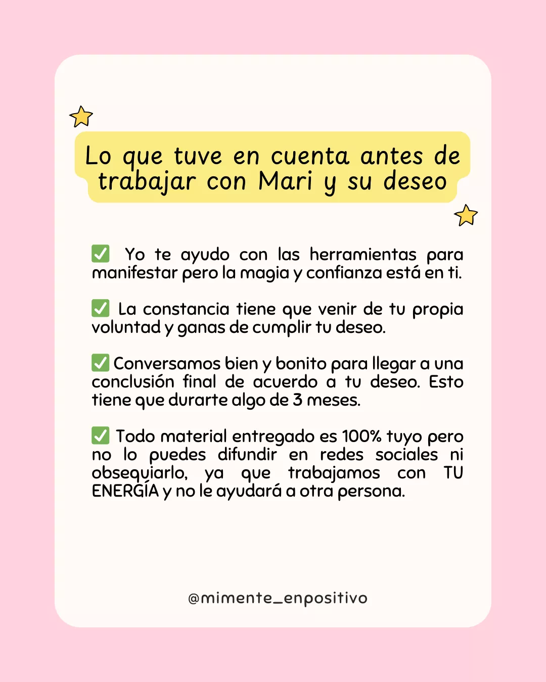 Además, trabajaremos juntas en una sesión personalizada, donde te acompaño para alinear tu energía, fortalecer tu fe y activar técnicas de manifestación efectivas que conecten con tu subconsciente y tu propósito.